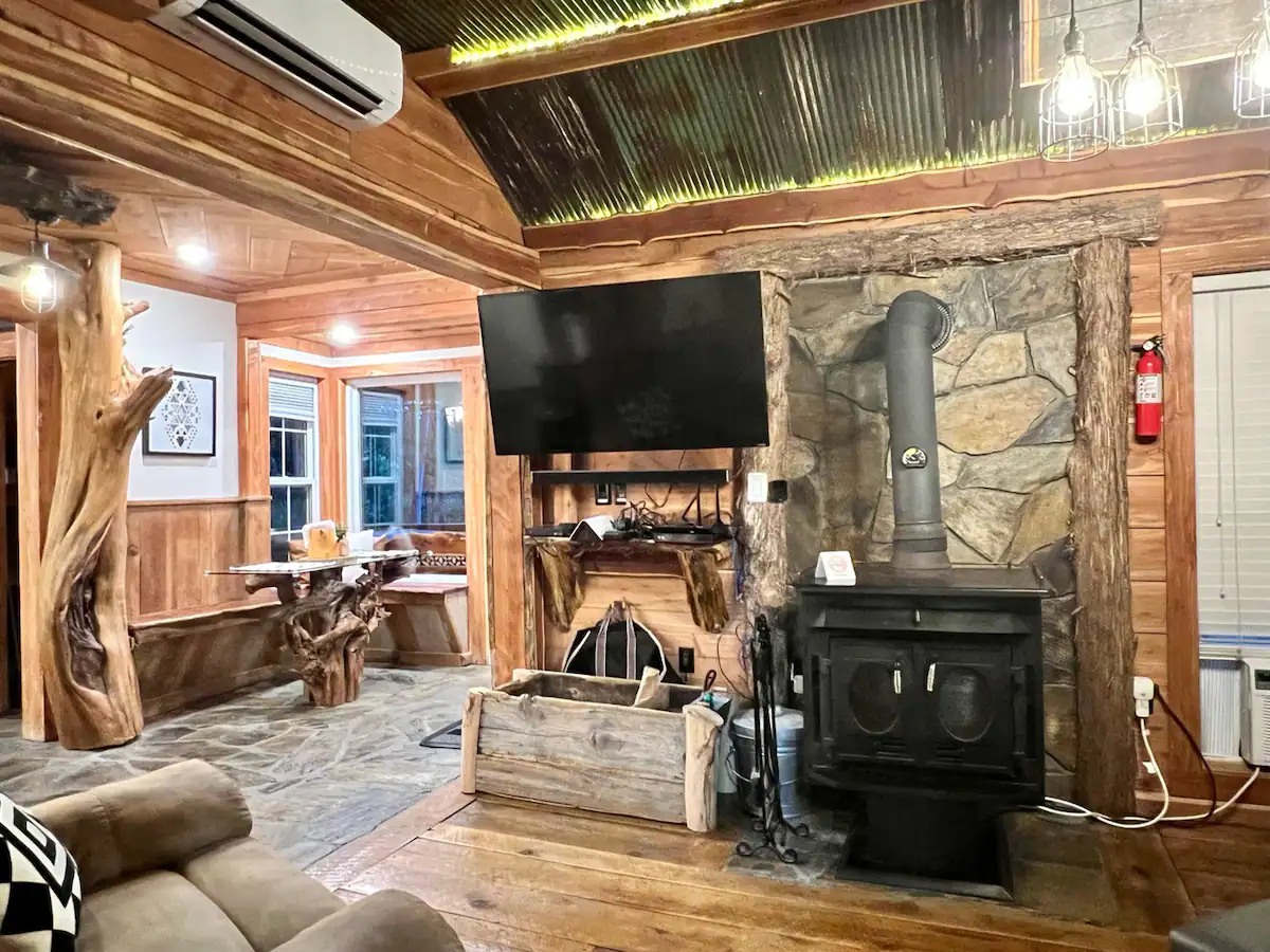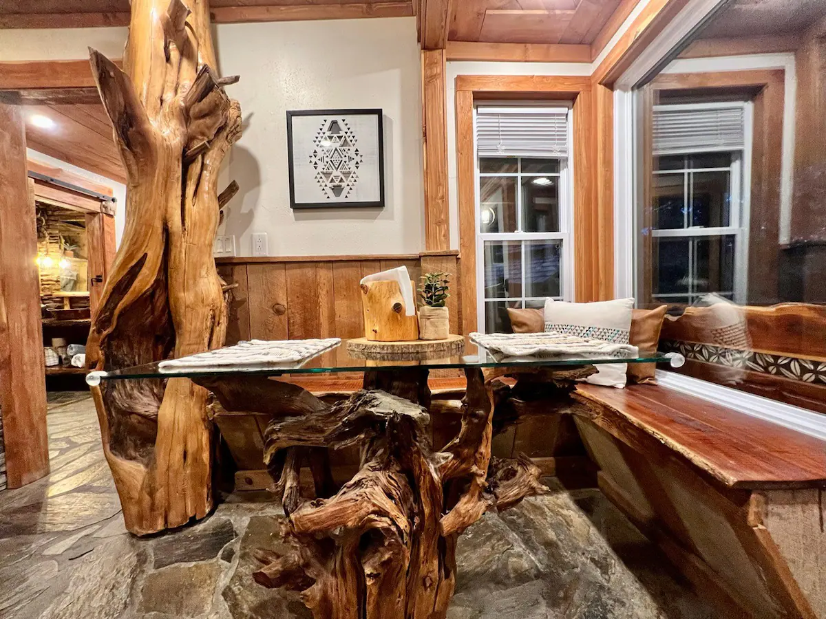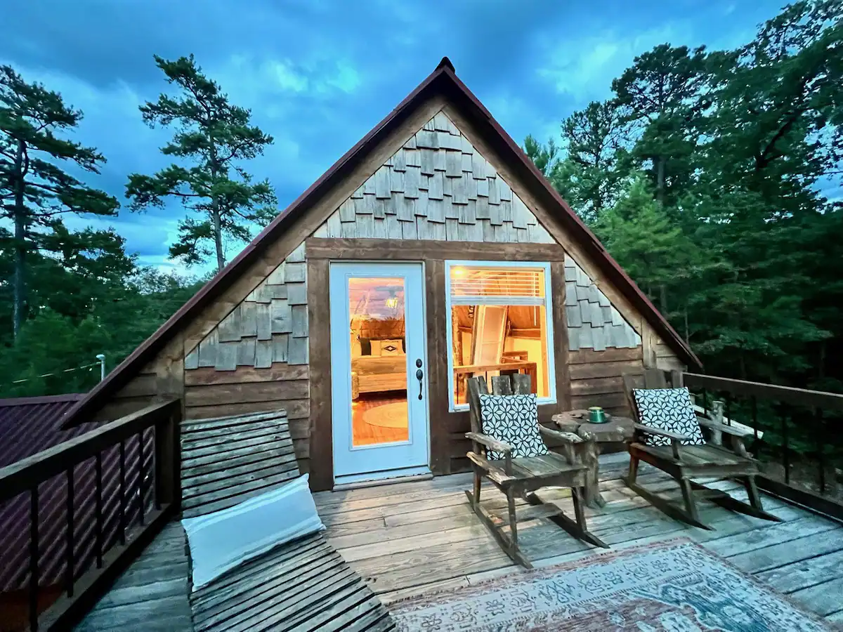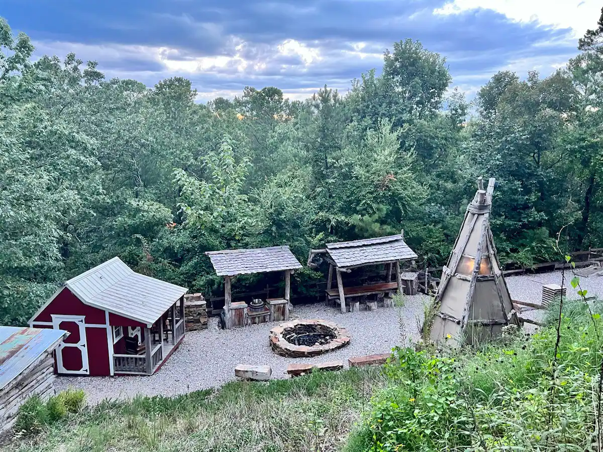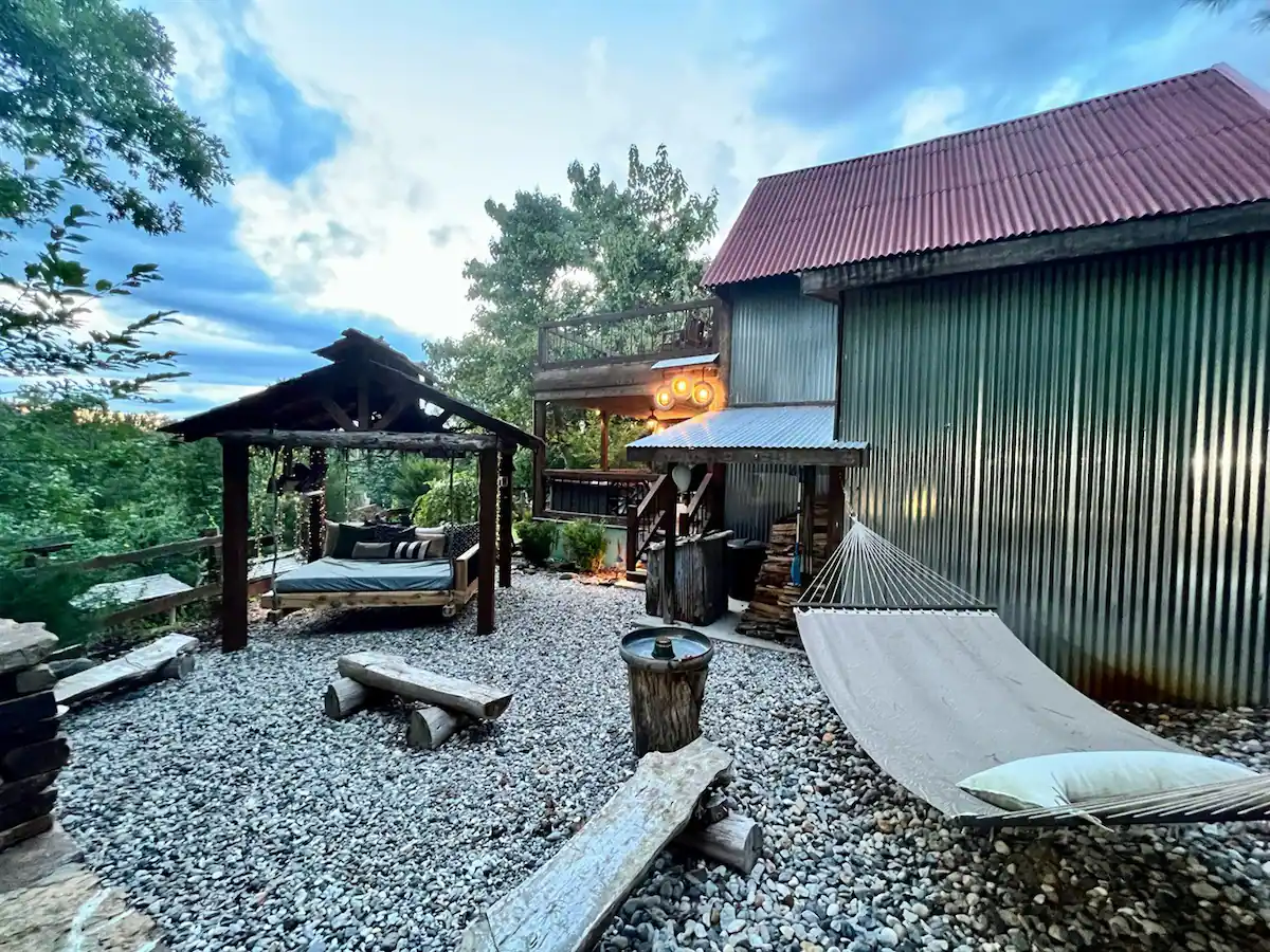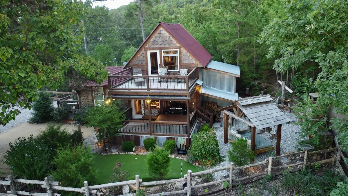 The Cedar Springs Cabin, located on the outskirts of beautiful Hot Springs, Arkansas, is a unique, one-of-a-kind experience. This beautifully crafted structure is rustic, yet modern. Enjoy gorgeous views from the top balcony or relax downstairs on the custom outdoor swinging bed. The property is perfect for a romantic couples getaway but also incredibly family-friendly with the outdoor game area and "buried bus" theater room!