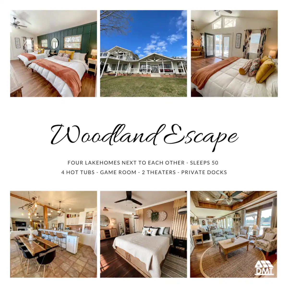Sleeping up to 50 guests, the Woodland Shore Escape is nestled on the far edge of Lake Hamilton, boasting unrivaled lake views. Our homes offer unique appointed design and comfort. There’s plenty of room for your boat with our private boat dock, and upon advanced notice we can facilitate a boat rental. We can’t wait to make your next vacation experience unforgettable. *We are proudly owned and operated by DMT Properties LLC, in Hot Springs, Arkansas.*